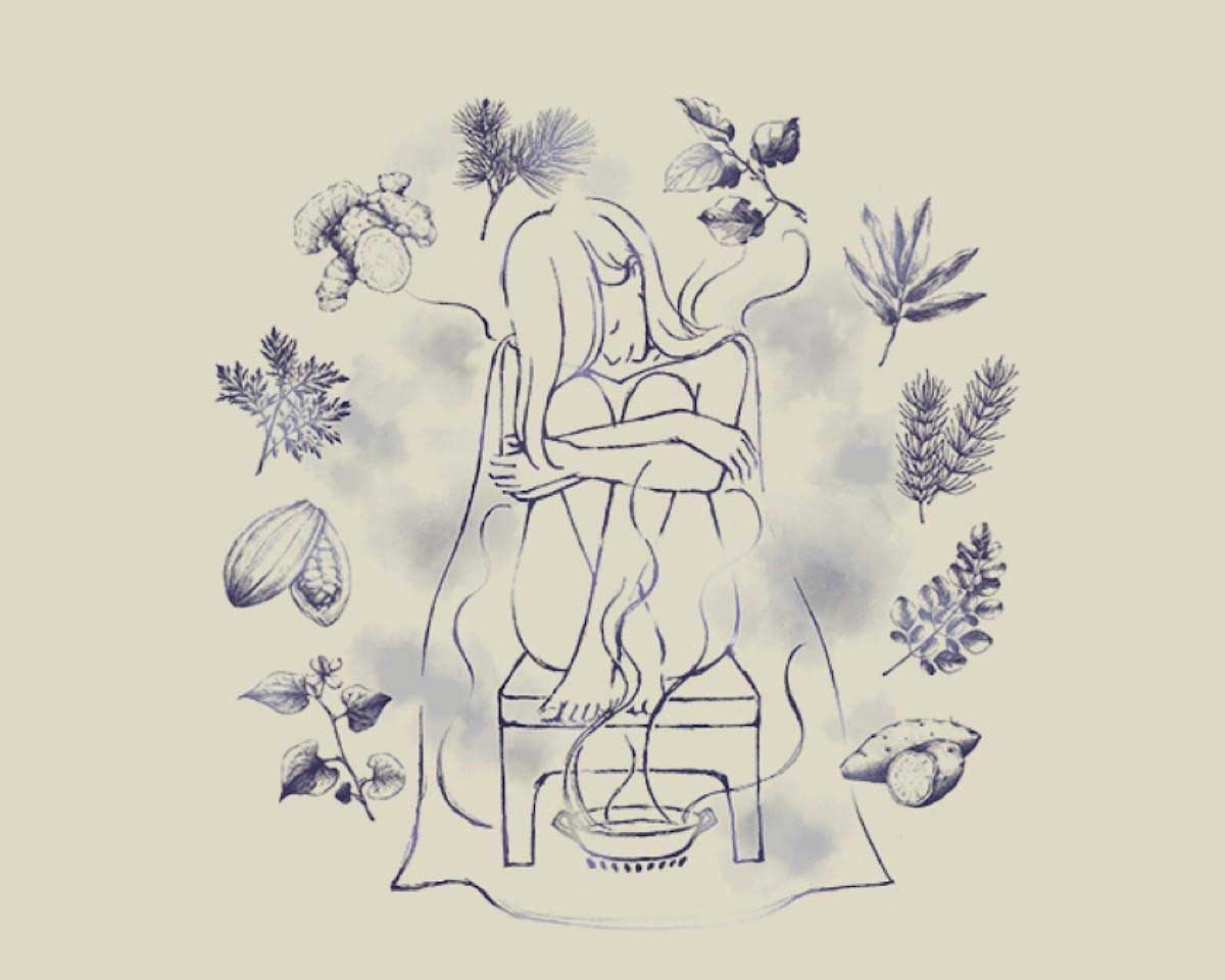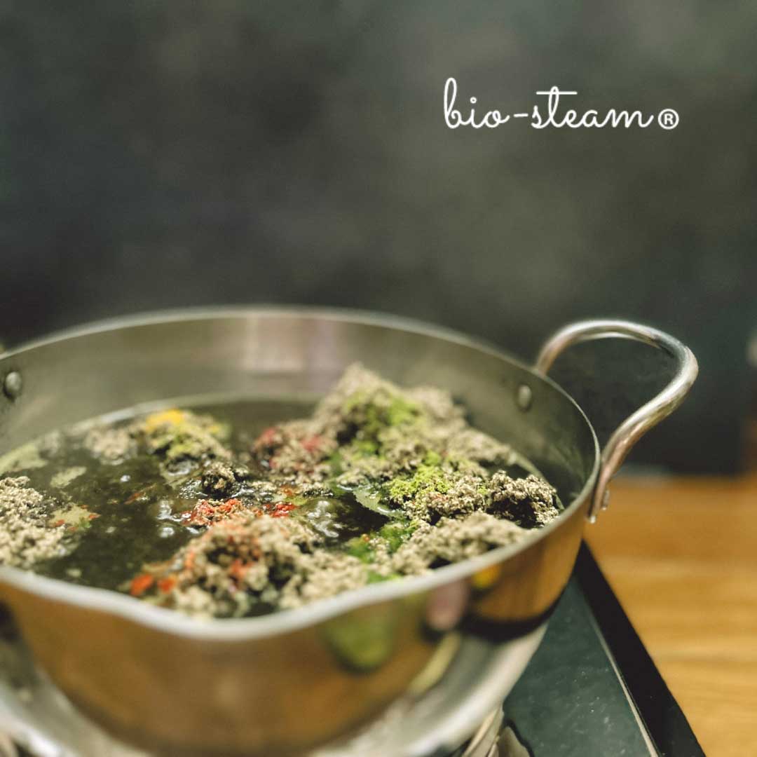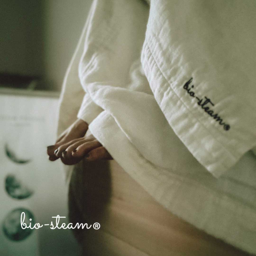 1.更衣室で衣服を脱いで、マントを着ます。 2. もぐさや野草パウダーを混ぜて配合し、お湯を入れて炊き上げます。自然そのままの繊細でパワフルな蒸気、それがビオスチームです。 3. ビオスチームの上に専用の椅子を設置し、その上にマントごとすっぽりと座ります。 4. 好きな体勢で座ったり、ストレッチをしてみたり思い思いの姿勢でリラックスしてお過ごしください。 5.なるべく部屋を暗くして、じっと体の中にスチームを吸い込みます。 6. 終わったらゆっくりお着替えください。